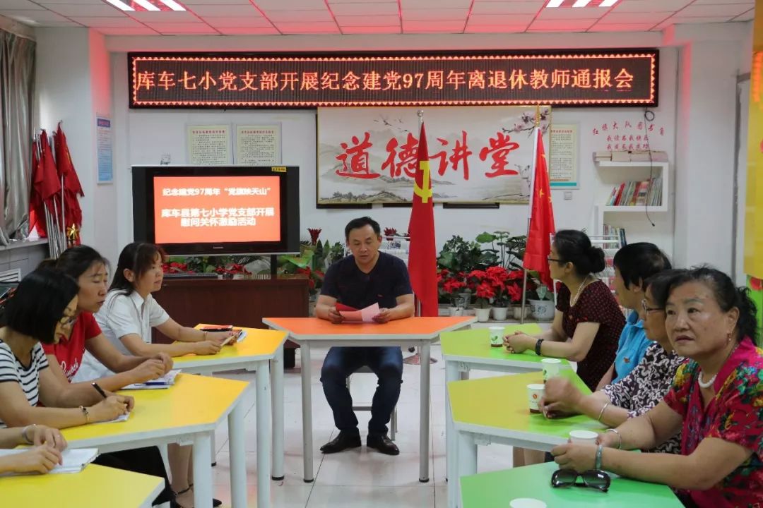 七一前夕,库车县第七小学举办了庆祝建党97周年“金色晚晴共映天山”主题党日活动。党支部书记李勇与退休老党员,重温入党誓词、赠送新党章、座谈慰问活动。